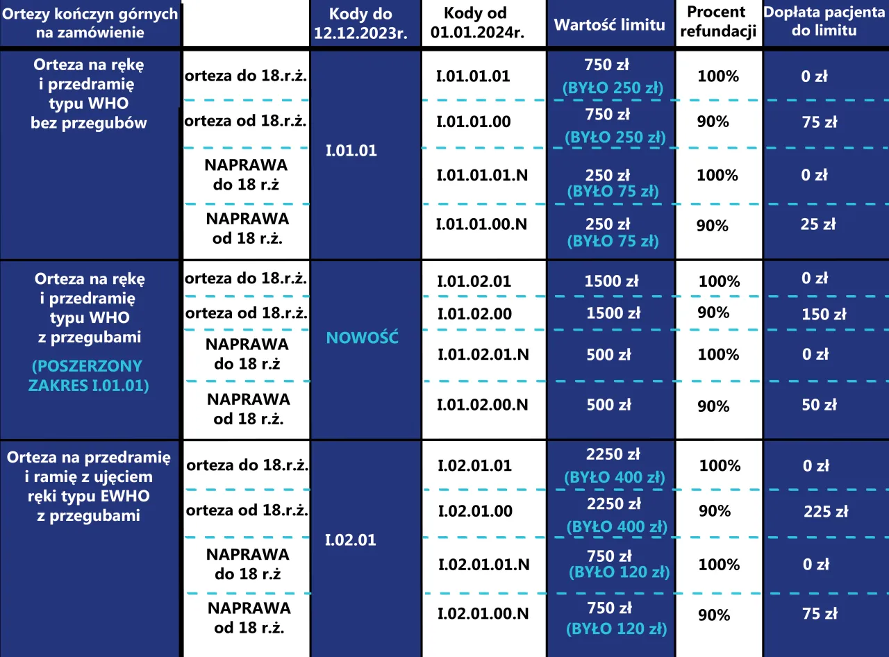 | Rodzaj ortezy | Limit refundacji | Dopłata pacjenta |